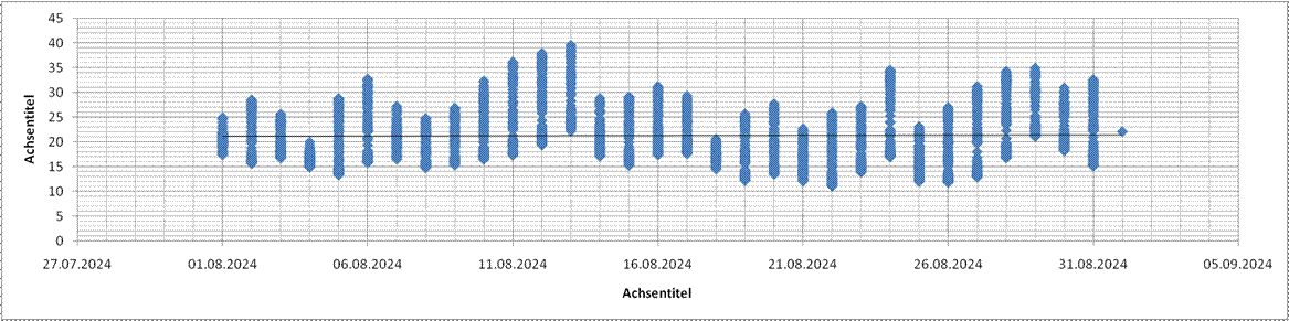 Temperaturverlauf/-verteilung August 2024==> Durchschnittstemperatur: 21,1°C (2023: 18,2°C, 2022: 23,0°C, 2021: 16,2°C, 2020: 21,1°C, 2019: 19,9°C, 2018: 20,9°C, 2017: 18,6°C, 2016: 19,2°C, 2015: 20,9°C, 2014: 15,6°C, 2013: 19,0°C, 2012: 20,6°C, 2011: 18,1°C, 2010: 16,6°C, 2009: 20,4°C, 2008: 17,5°C, 2007: 17,5°C, 2006: 14,7°C, 2005: 16,6°C, 2004: 19,1°C)