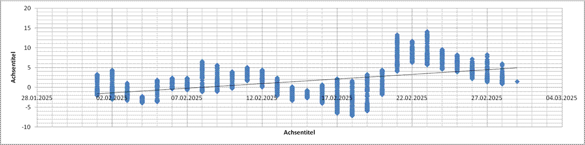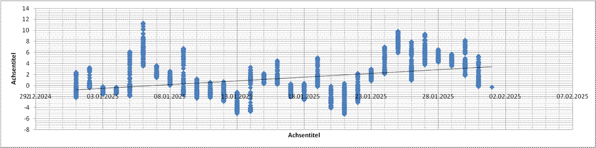 Temperaturverlauf/-verteilung Januar 2025 ==> Durchschnittstemperatur: 1,2°C (2024: 0,9°C, 2023: 2,1°C, 2022: 1,3°C, 2021: -0,3°C, 2020: 1,7°C, 2019: -1.1°C, 2018: 3,2°C, 2017: -2,6°C, 2016: 1,0°C, 2015: 0,7°C, 2014: 2,4°C, 2013: -0,6°C, 2012: 1,2°C, 2011: 0,3°C, 2010: -3,8°C, 2009: -2,5°C, 2008: 2,5°C, 2007: 3,4°C, 2006: -2,0°C, 2005: 0,9°C, 2004: 0,1°C)