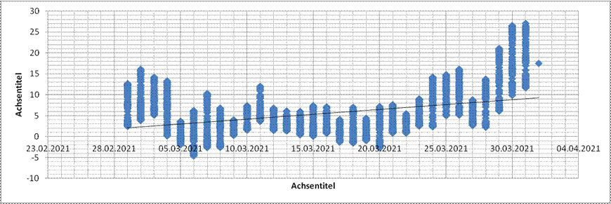 Temperaturverlauf/-verteilung März 2021 ==> Durchschnittstemperatur: 5,5°C (2020: 5,6°C, 2019: 6,0°C, 2018: 2,7°C, 2017: 7,9°C, 2016: 3,4°C 2015: 5,3°C, 2014: 8,4°C, 2013: 0,9°C, 2012: 8,2°C, 2011: 6,8°C, 2010: 4,2°C, 2009: 4,0°C, 2008: 3,4°C, 2007: 6,2°C, 2006: 1,9°C, 2005: 4,8°C, 2004: 4,4°C)