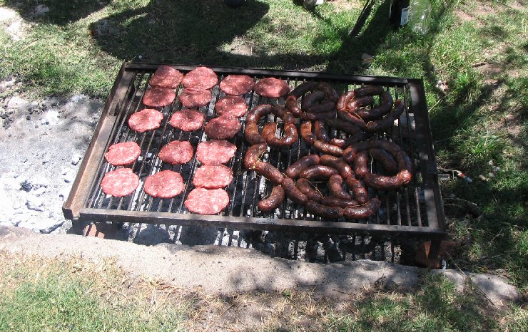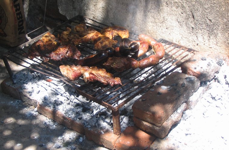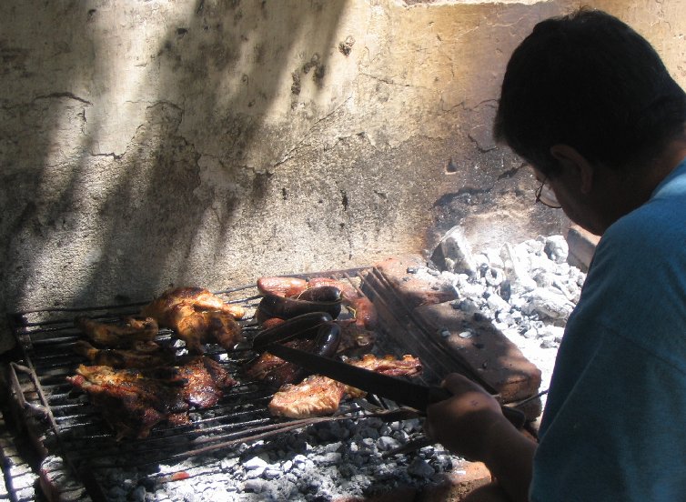 Meist wird hierfür nur Holz verwendet, seit Neuestem manchmal auch etwas Holzkohle. Man hat eine gemauerte Platte (Asador) auf der dann die Glut aus dem Feuer gleichmäßig verteilt wird. Danach wird ein ziemlich großer Rost (Parrilla) darüber aufgebaut. Hierbei gibt es unterschiedliche Größen. Je größer desto größer und angesehener ist die Familie. Wie gesagt, man ist immer darauf vorbereitet, dass jemand zum Asado dazukommt. Die Glut unter dem Parrilla wird standig aus dem Feuer mit einer kleinen Metallschaufel nachgelegt. Dadurch entsteht im Asador eine gleichmäßige Hitze, die über einen langen Zeitraum aufrechterhalten wird. Gegrillt werden auf dem Parrilla nur sehr große Stücke Fleisch, die meist nur mit Salz gewürzt werden. Der Grillvorgang dauert sehr lange. Das Fleisch wird je eine Stunde pro Seite gegrillt. Verfeinert wird der Geschmack, indem man Zitronenscheiben auf das Fleisch legt. Möglich ist diese lange Grillzeit, da im Asador eine gleichmäßige, aber nicht sehr hohe Hitze herrscht. Das Fleisch wird somit durchgegart, ohne dass der äußere Bereich verbrennt oder schwarz wird. Die Kunst desjenigen der Asado macht (auch Asador genannt) ist, die gleichmäßige Hitze im Asador aufrecht zu erhalten und das Fleisch im richtigen Moment zu wenden und schließlich von der Parrilla zu nehmen. Unser Gastgeber war hier ein wirklicher Experte.