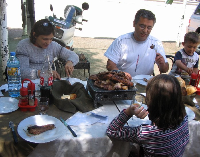 Für uns waren die Fleischportionen natürlich viel zu groß. Man hat uns etwas schief angeschaut, als wir nur die für Deutschland üblichen Fleischmengen zu uns genommen hatten. Das Grillfleisch hat einen wirklich sehr guten Geschmack, den man so schnell nicht vergessen wird. Man holt mit dieser Zubereitungsmethode wirklich eine Menge auch aus minderwertigerem Fleisch heraus, da das Fett durch die lange Garzeit vollständig aus dem Fleisch verschwindet. Als wir einmal wie in Deutschland üblich einige Salate (Kartoffel-, Nudelsalat usw.) zum Asado zubereitet hatten, wurden diese Salate nur aus reiner Höflichkeit probiert. Lediglich die Kinder unseres Gastgebers, die für neue Dinge sehr aufgeschlossen waren, haben sich über die Salate hergemacht.